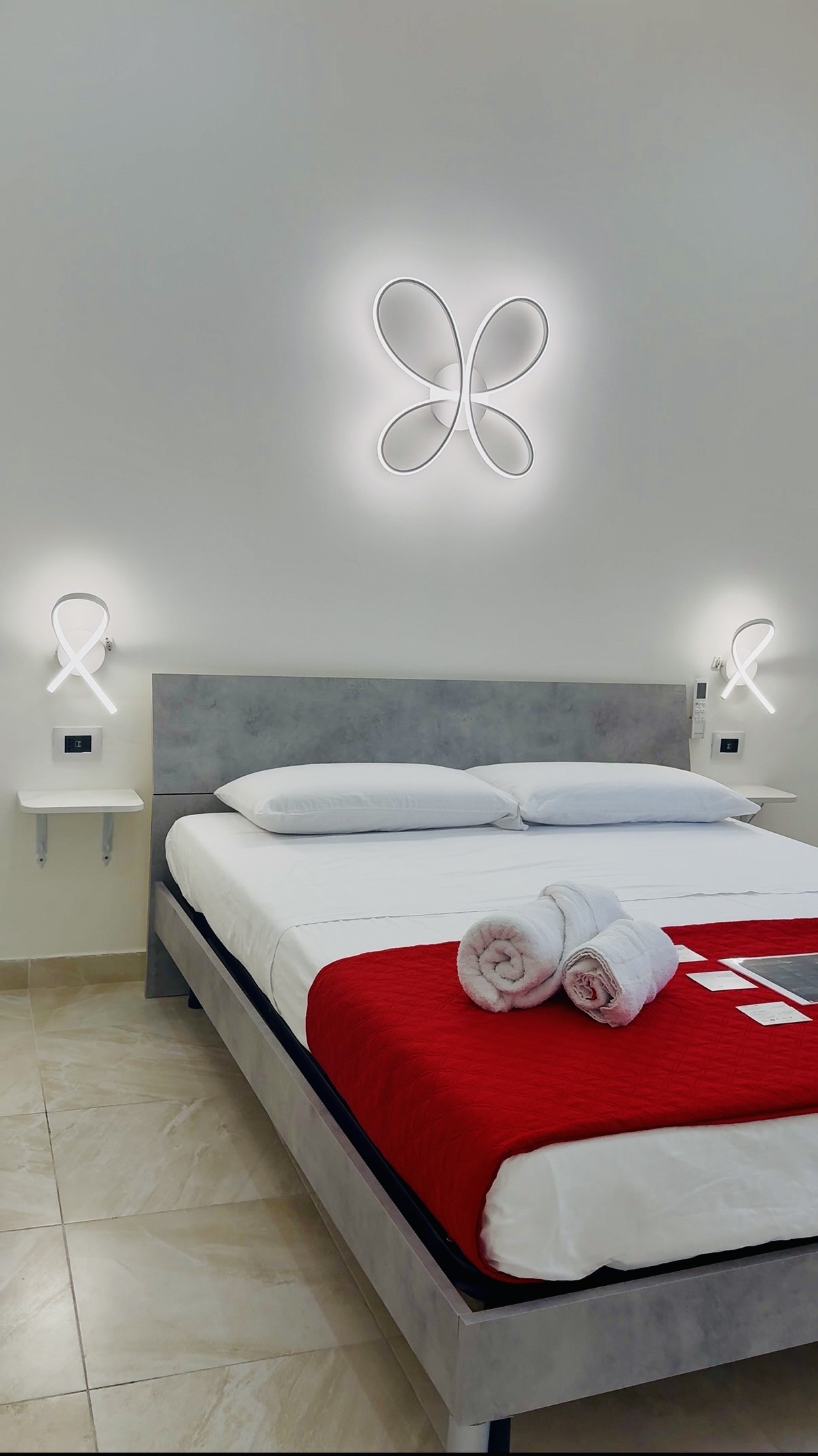 La camera è dotata di tutti i comfort essenziali per un soggiorno piacevole: scrivania, frigorifero, aria condizionata e biancheria fresca e accuratamente selezionata. Gli arredi sono sobri ma ricercati, con una palette neutra arricchita da dettagli rossi che creano un’eleganza discreta ma distintiva.